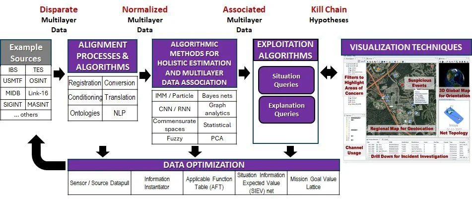Level 0 Fusion. Level 0 fusion functions operate on sensor data to produce (extract) features using inference models. For imaging sensors, e.g., Electro Optical (EO), Infrared (IR), and LIDAR, object classification (labeling) is inferable using inference models developed by Deep Learning (DL) processes trained in the mission planning phase on targets and environments representative of those expected in the mission area, e.g., Air Tasking Order (ATO) area. The Level 0 fusion outputs are object/entity detections, image bounding boxes within the image frame(s), and broad classifications, e.g., “building”, “vehicle”. For the Electro-Magnetic (EM) sensors, sensor platforms may reconnoiter near to the targets to detect and triangulate intentional and non-intentional EM emissions from, e.g., Low Probability of Intercept (LPI) emissions, motor generators, and computer networks. The Level 0 fusion outputs are estimated waveform parameters, broad classifications, and Lines of Bearing (LOB). DF Level 0 often includes an ontology and knowledge base of a priori data based on in-depth exploitation of all knowledge derived from an Intelligence Preparation of the Operational Environment (IPOE) including target and confounder Characteristics and Performance (C&P), Order-of-Battle (OB), terrain data, ambient objects, man-made structures, avoidance areas, and other GEOspatial INTelligence (GEOINT). This data is structured into a formal ontology to support processing by DF functions.